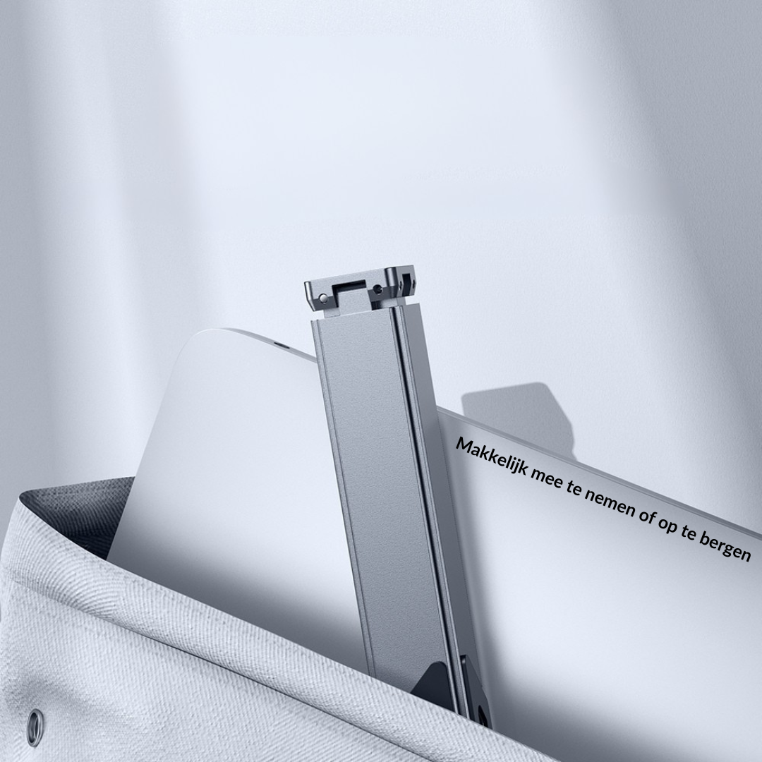 Met zijn uniek en stijlvol design, lichtgewicht aluminium constructie en compact formaat neem je hem moeiteloos overal mee. Toch blijft hij verrassend stevig en stabiel. De verstelbare hoogte garandeert een ergonomische werkhouding, terwijl de open structuur zorgt voor optimale ventilatie en een koel blijvende laptop.